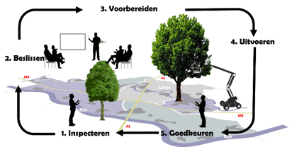 We beheren onze bomen in een cyclus, zie afb. 5. We hebben onze gemeente verdeeld in drie regio’s en ieder jaar volgen we in deze regio een vaste beheercyclus. Die verloopt als volgt: