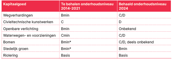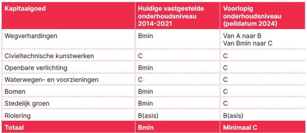 Daarbij brengen we het onderhoudsniveau via deze actualisatie van het beleidskader terug naar gemiddeld onderhoudsniveau C. Dit doen we in de wetenschap dat er momenteel onderdelen een niveau onder C hebben en deze dus op een niveau van minimaal C gebracht moeten worden, er daarnaast ook capaciteit nodig is om achterstand en achterstalligheid weg te werken en een goed beeld van de huidige toestand van een aantal kapitaalgoederen ontbreekt.