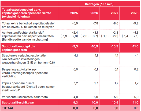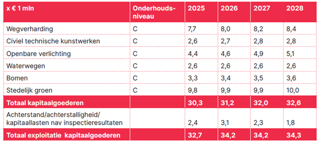 Tabel 5.4 bevat de benodigde extra middelen voor de planperiode 2025-2028 om de kapitaalgoederen op een gemiddeld onderhoudsniveau C realistisch te kunnen beheren en onderhouden. Hierbij hanteren we de volgende uitgangspunten: