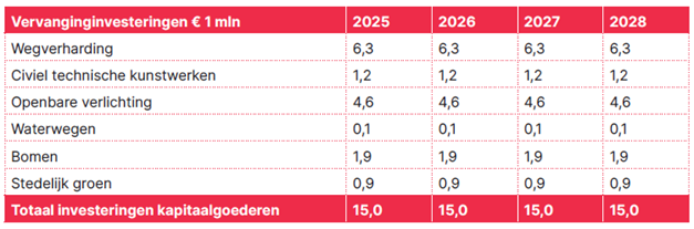 De benodigde vervangingsinvesteringen voor de periode 2025-2028 hebben we opgenomen in tabel 5.3. De bijbehorende kapitaallasten zijn verwerkt in tabel 5.2. De vervangingsinvesteringen zijn nodig om structureel op het gewenste onderhoudsniveau te kunnen blijven.