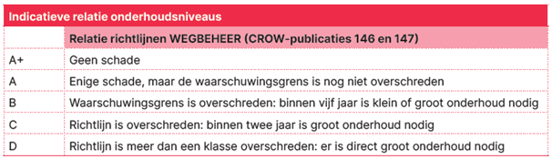 De technische staat bestaat uit de technische kwaliteit en de beeldkwaliteit (uiterlijke kenmerken). We hanteren in dit beleidskader voor duiding van de technische kwaliteit dezelfde CROW-maatlat als voor beeldkwaliteit. Onderstaande tabel illustreert voor wegverhardingen de doorvertaling van beeldkwaliteit en technische kwaliteit naar onderhoudsniveaus: