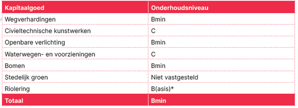 * Voor riolering is beeldkwaliteit geen criterium, om deze reden hanteren we het onderhoudsniveau. Basis (‘een goed en robuust water- en rioleringssysteem’).