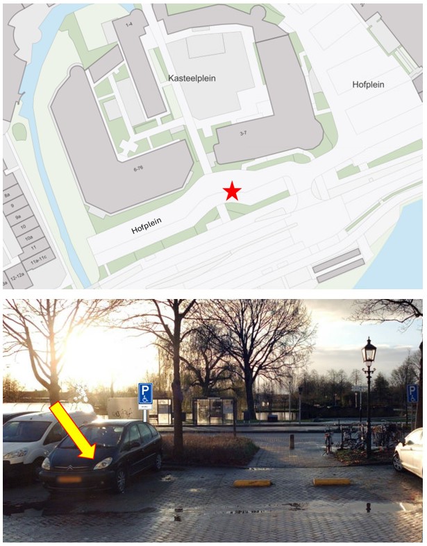 - tot het aanwijzen van een bestaande algemene gehandicaptenparkeerplaats op kenteken op het Hofplein ter hoogte van het voetpad naar het Kasteelplein door het plaatsen van onderbord met kenteken onder het aanwezige verkeersbord E6 van Bijlage 1 van het RVV 1990.
