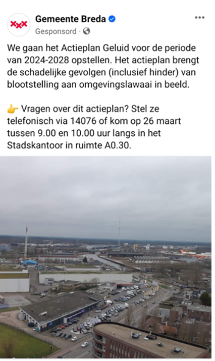Het Ontwerp Actieplan Geluid 2024-2028 is bekend gemaakt in het gemeenteblad en heeft ter inzage gelegen van 13 juni tot en met 24 juli 2024 bij de Infobalie in het Stadskantoor, Claudius Prinsenlaan 10 te Breda en digitaal in te zien als bijlage bij deze bekendmaking. Eenieder heeft in die tijd een zienswijze in kunnen dienen op het Ontwerp Actieplan Geluid 2024-2028.