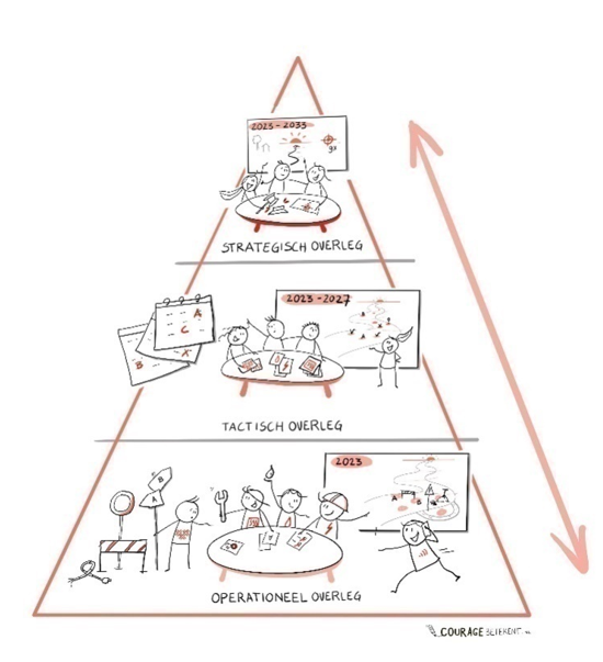De samenwerkingsvorm die nu voor het programmeerproces wordt ontwikkeld, bestaat uit bespreektafels op 3 niveaus: strategisch, tactisch en operationeel. Dit wordt aangevuld met o.a. de wijze van verbinden van de tafels en escaleren vanuit de tafels. Zie figuur voor een heel globaal overzicht.