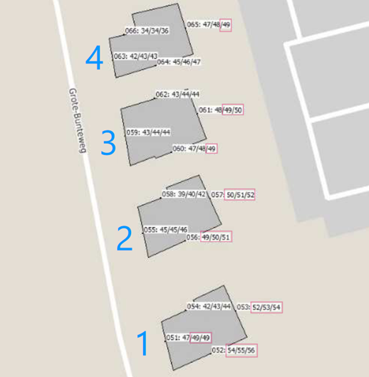 De plaats van de 4 woningen nabij de Elburgerweg / Grote Bunteweg (de 4 zogenoemde "poortwoningen")