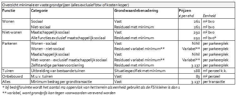 Grondprijzen zijn afhankelijk van de te realiseren functie. Een functie kan bestaan uit verschillende categorieën. Afhankelijk van de functie en categorie geldt óf de vaste grondprijs óf de residuele grondprijs met een minimum. Voor functies met een residuele grondprijs met een minimum wordt een externe taxatie uitgevoerd. Voor functies waar een vaste grondprijs geldt wordt geen taxatie uitgevoerd.
