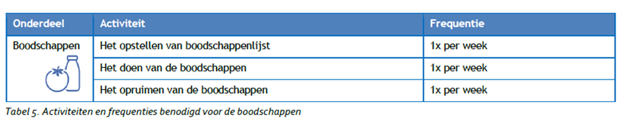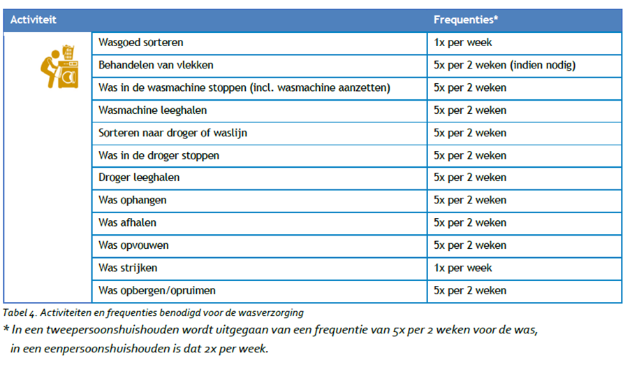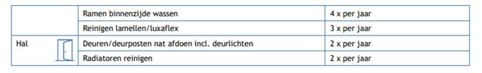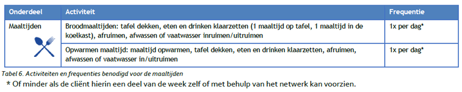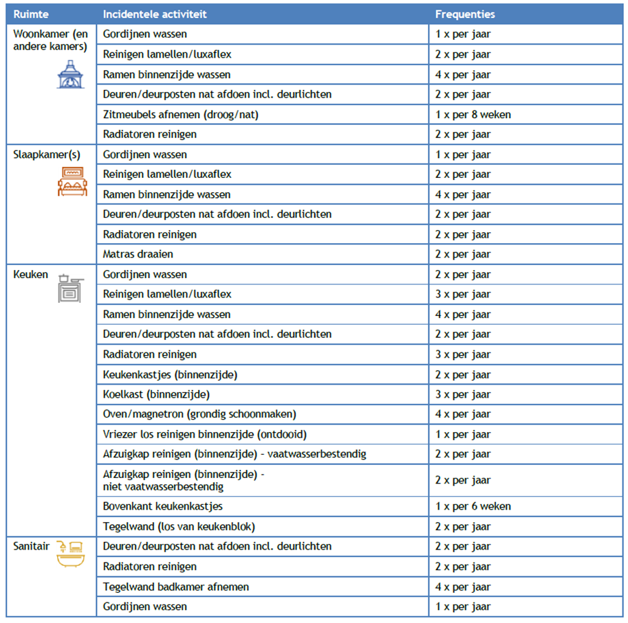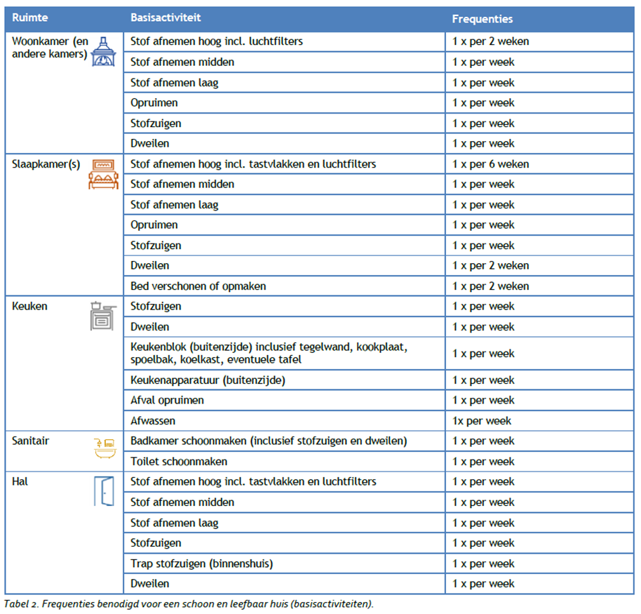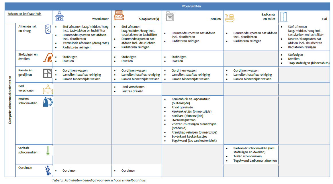 In tabel 1 zijn alle activiteiten benodigd voor een schoon en leefbaar huis beschreven. Daarnaast bestaat het Normenkader uit frequentieoverzichten die als basis voor het leveringsplan. Hier kan in overleg tussen aanbieder en cliënt (en met akkoord van cliënt) gemotiveerd van worden afgeweken.