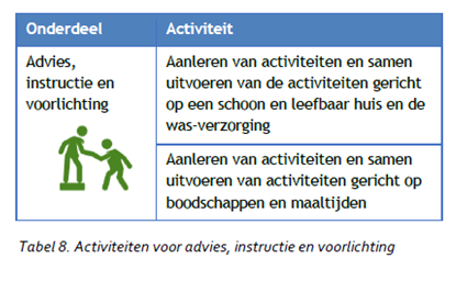 Het gaat om activiteiten gericht op het bevorderen of behoud van de zelfredzaamheid en/of maatschappelijke participatie. Gedacht kan worden aan het kunnen doen van de administratie, het plannen van de week, regelzaken- en geldzaken, het uitvoeren van algemeen dagelijkse levensverrichtingen, het hebben van een zinvolle invulling van de dag en ondersteuning bij het oplossen van problemen. Ook het ontlasten van de mantelzorger en/of gezinsleden maakt hier onderdeel van uit. Het gaat om activiteiten gericht op het bevorderen van de inzet van mantelzorg en/of het continueren van de inzet van de mantelzorg (voorkomen van overbelasting bij de mantelzorger). Gedacht kan worden aan logeervoorzieningen of vormen van dagbesteding etc.