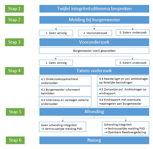 De burgemeester voert een gesprek met de politieke ambtsdrager in kwestie. Indien nodig wordt ook een gesprek gevoerd met de melder. Wanneer de melding over een wethouder gaat is de gemeentesecretaris bij de gesprekken aanwezig. Als de melding over een raads-(commissie-)lid gaat, is de griffier aanwezig.