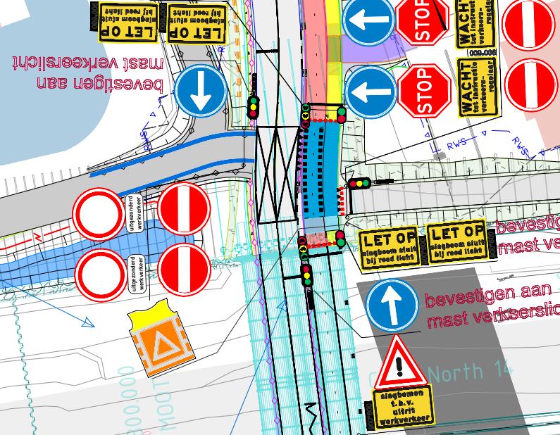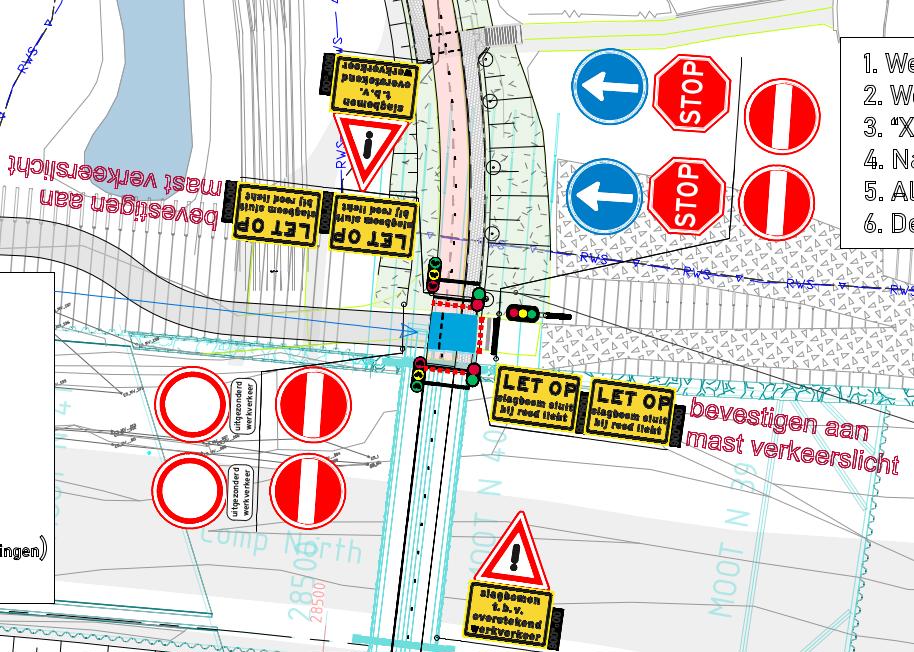 Dit gebeurt door het aanleggen en/of aanpassen van kruisingen van een bouwweg met de Amsterdamseweg en het Kazernepad. Hierbij worden de onderstaande borden en verkeerstekens uit bijlage 1 van het Reglement verkeersregels en verkeerstekens 1990 (RVV 1990) aangebracht.