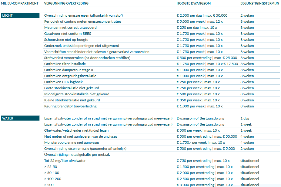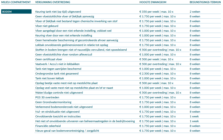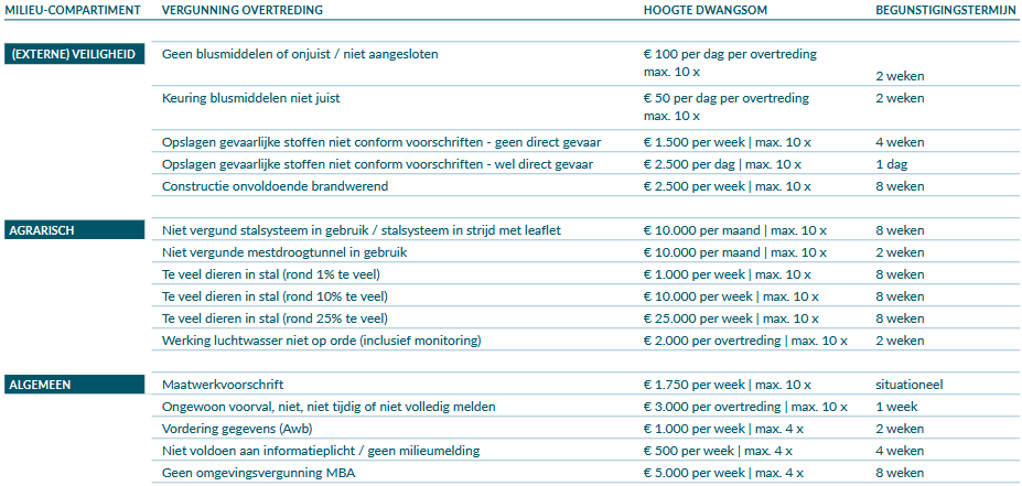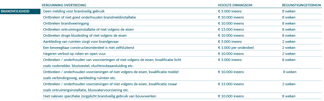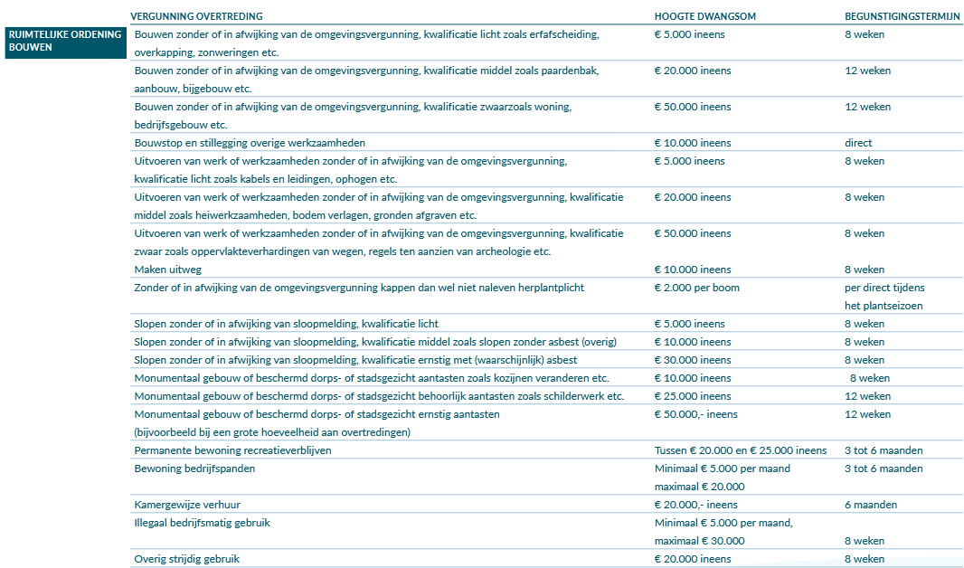 De tabellen zijn niet volledig uitputtend. Als een overtreding niet voorkomt in het schema, dan zal voor de bepaling van de hoogte van de dwangsom en duur van de begunstigingstermijn aansluiting worden gezocht bij een in de tabel genoemde overtreding die het meest overeenkomt met de overtreding in de desbetreffende casus.