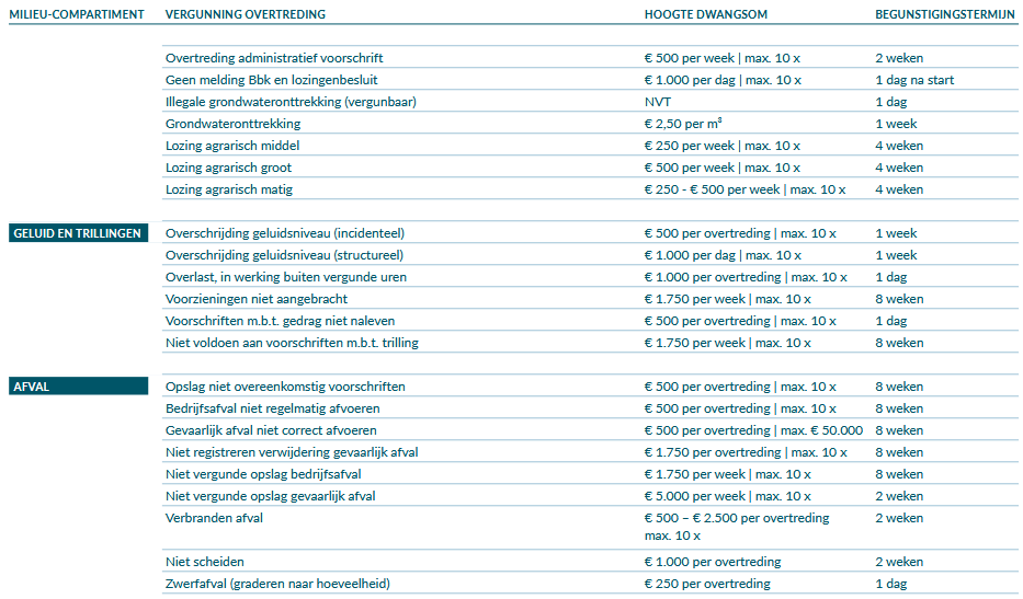De tabellen vermelden de meest voorkomende overtredingen, de indicatieve dwangsomhoogten en de daaraan verbonden begunstigings- termijnen. Hierna wordt beschreven hoe de tabellen moeten worden geïnterpreteerd en gehanteerd.