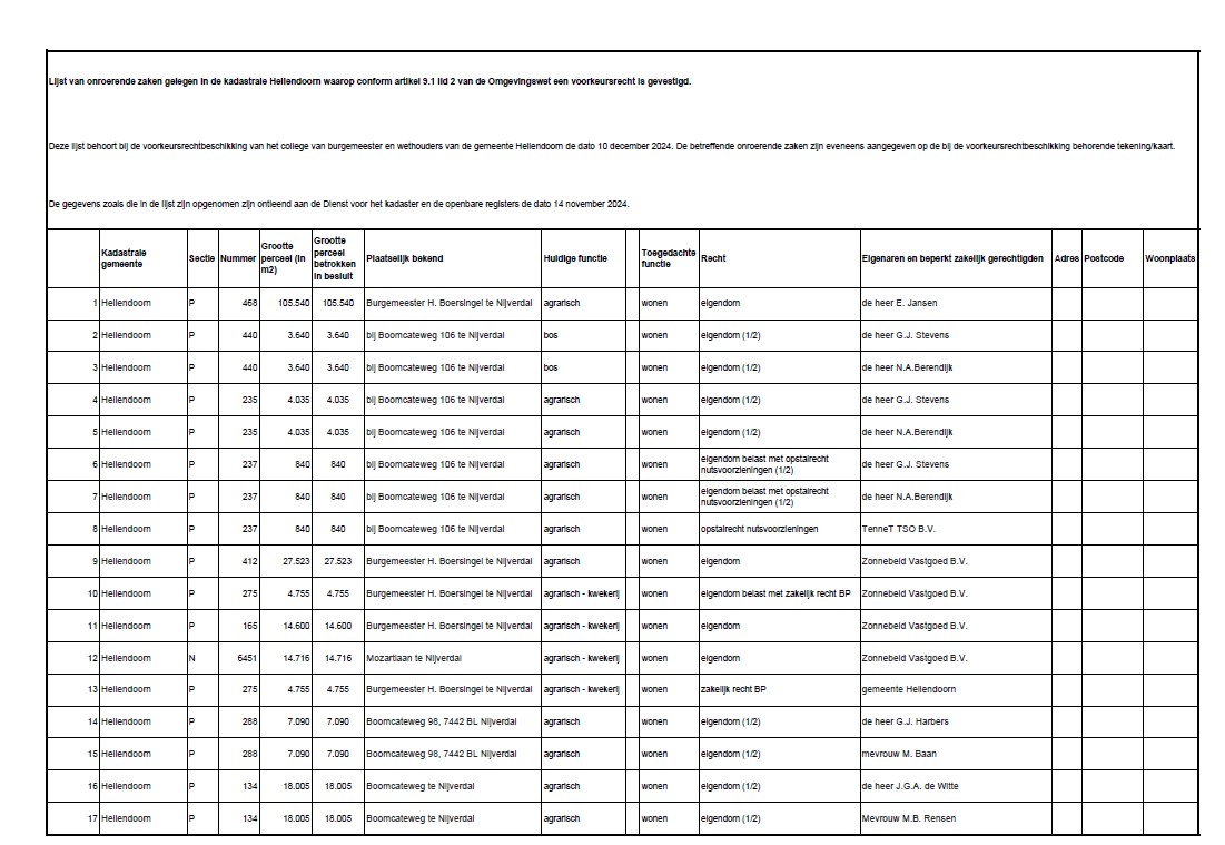 Het college van burgemeester en wethouders van de gemeente Hellendoorn geeft op grond van artikel 16.32b van de Omgevingswet kennis dat het op 10 december 2024 een voorkeursrechtbeschikking heeft genomen op grond van het bepaalde in artikel 9.1, tweede lid van de Omgevingswet. Hiermee is op diverse onroerende zaken een voorkeursrecht gevestigd en een voorstel voor het nemen van een opvolgende voorkeursrechtbeschikking door de raad.