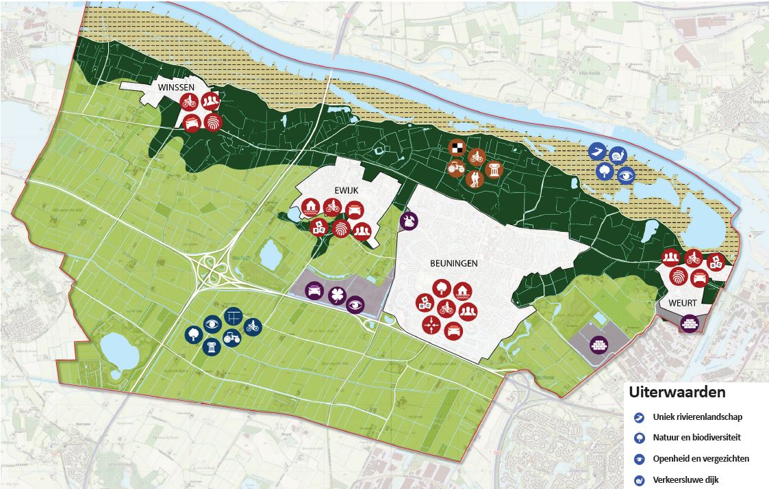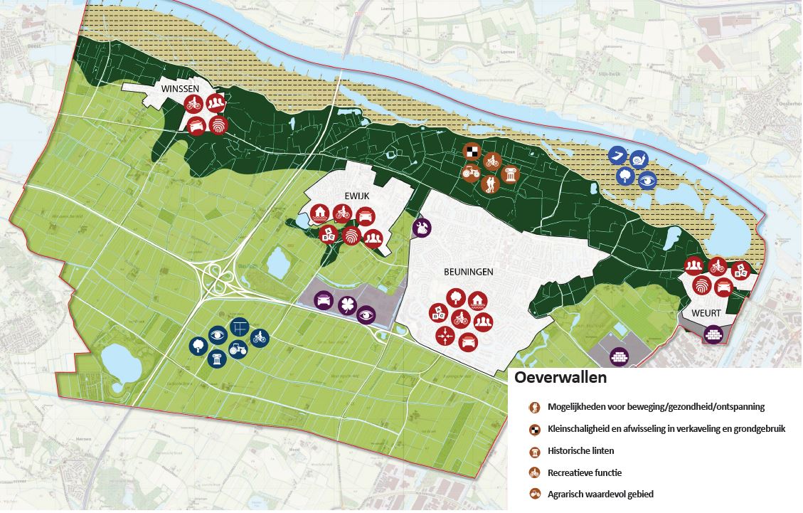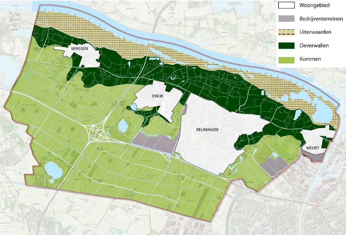 In het buitengebied is nieuwbouw van woningen mogelijk ter compensatie van de sloop van (voormalige/agrarische) bedrijfsbebouwing. Dit is ook het uitgangspunt voor het oeverwallengebied. Hier is echter wel een mogelijkheid om onder voorwaarden op enkele locaties meer woningen toe te staan. Met maatwerk is het mogelijk om in combinatie met kwaliteitsverbetering, behoud en versterking cultuurhistorisch erfgoed, natuur- en landschapsontwikkeling extra woningen toe te voegen in de linten van Ewijk en Winssen. Ook kan gedacht kan worden aan enkele verspreid liggende erfontwikkelingen of buitenplaatsen gekoppeld aan de