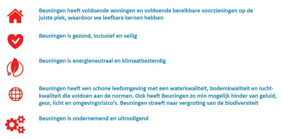 In de Omgevingsvisie Beuningen richten we ons op 5 ambities. Deze ambities zijn gebaseerd op de analyse van de trends en ontwikkelingen die op ons af komen en de beleidsanalyse, zoals die zijn opgenomen in de Notitie van Uitgangspunten Omgevingsvisie Beuningen. De ambities laten zien welke onderwerpen wij als gemeente belangrijk vinden en waaraan we de komende jaren willen werken. Dit willen we samen doen met onze inwoners, organisaties, de regio en overige partners. Bij het werken aan de toekomst van Beuningen beschermen we landschappelijke, cultuurhistorische en archeologische waarden. Deze waarden zijn het uitgangspunt bij ontwikkelingen, samen met de kernwaarden uit ons motto.