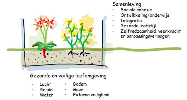 Een gezonde leefomgeving vraagt om een goede kwaliteit van het fysieke leefmilieu. Denk aan een goede luchtkwaliteit, goede bodemkwaliteit, geen geluidsoverlast en een veilige omgeving.