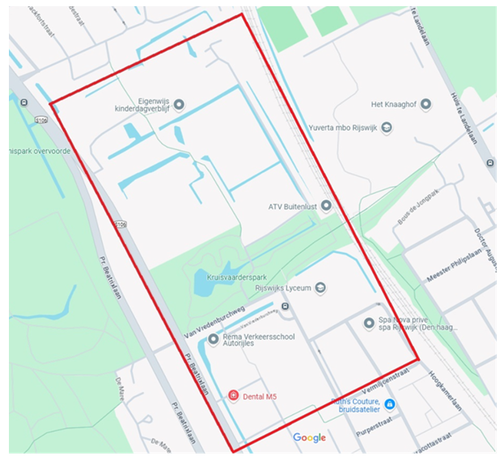 het gebied in en rondom het Kruisvaarderspark, begrensd door de Guntersteinweg te Den Haag, de Prinses Beatrixlaan te Rijswijk, de Vermiljoenstraat te Rijswijk, de spoorlijn (of de Monseigneur P.J. Willekenslaan te Rijswijk, de staat aan de ander zijde van het spoor). De aangegeven wegen vallen niet binnen dit gebied.