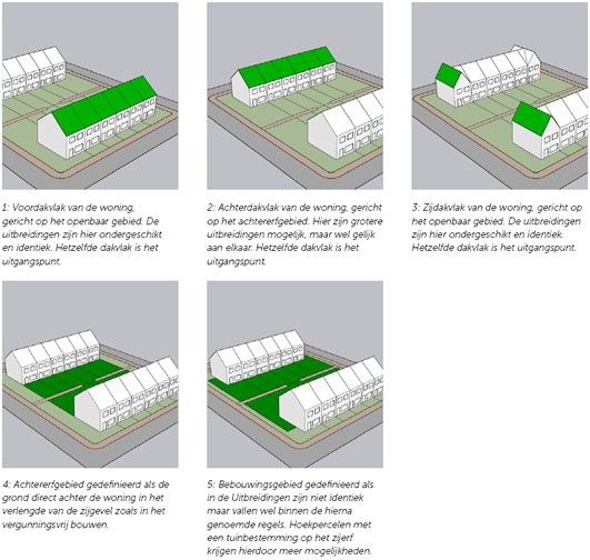 Hieronder een verbeelding van het 1) voordakvlak 2) achterdakvlak 3) zijdakvlak 4) achtererfgebied 5) bebouwingsgebied binnen deze beleidsregel.