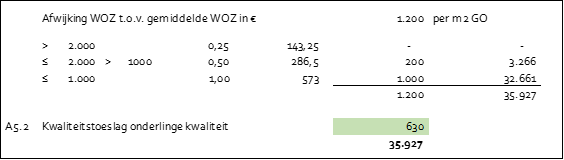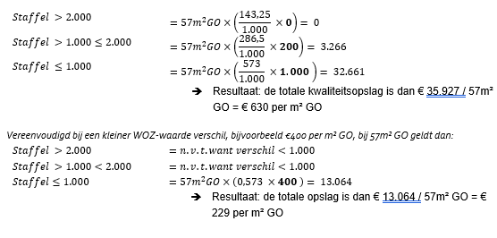 Met het verschil tussen de WOZ-waarden wordt voor tot en met de eerste €1.000,- verschil, een opslag gerekend ter hoogte van €573,- per m². Vanaf €1.000,- tot en met €2.000,- verschil geldt een opslag van €286,50 per m²/1.000 en vanaf €2.000 verschil bedraagt de opslag €143,25 per m2. Voorbeeld: De WOZ-waarde van een galerijwoning is € 1.200 per m2 hoger dan de gemiddelde WOZ waarde van een galerijwoning van dezelfde woninggroottecategorie in de buurt. De positieve afwijking van € 1.200 per m2, leidt voor een woning van 57 m² GO tot een kwaliteitstoeslag van € 35.927. De berekening ziet er als volgt uit:
