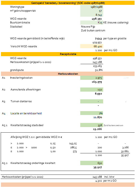 De onderdelen A1 t/m A5.2 opgeteld bepalen de herbouwkosten voor de referentie, op basis van de locatie en WOZ-gegevens.
