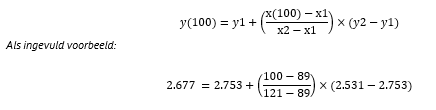 Voorbeeld: bij een beneden- bovenwoning (SOC 1987 / 1988) van 100m² GO groot, liggen de kosten voor onderdeel A1 tussen meetpunt 3 (89m² GO bij €2.753,-) en meetpunt 4 (121 m² GO €2.531,-) in. Om de waarde dat behoort bij 100 m2 te kunnen bepalen, wordt de methode van interpolatie toegepast middels de volgende formule:
