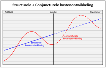 De conjuncturele kostenontwikkeling is een algemene prijsontwikkeling die wordt veroorzaakt door een verschuiving van de vraag bij een onveranderd aanbod. Bijvoorbeeld bij een stijgende vraag en een (op korte termijn) gelijkblijvend aanbod, zullen de kosten stijgen. Deze kostenontwikkeling heeft dus betrekking op de aanbestedingsmarkt. Dit wordt uitgedrukt in de marktindicator (%) en beweegt zich om de structurele kostenontwikkeling heen en kan derhalve positief en negatief zijn. Ter illustratie is onderstaande grafiek opgenomen met een voorbeeld van hoe de ontwikkeling van de structurele en de conjuncturele kostenontwikkeling eruit kan zien.