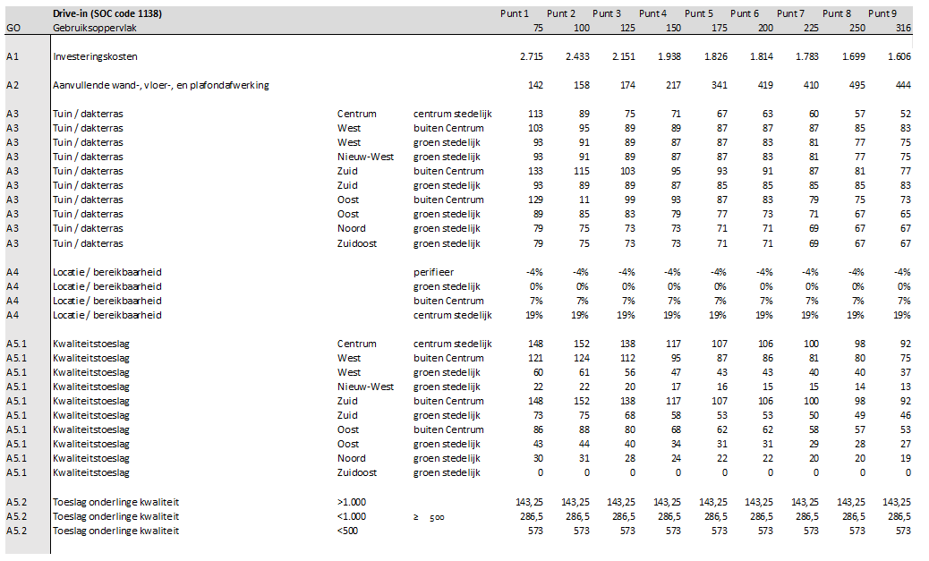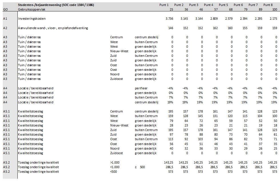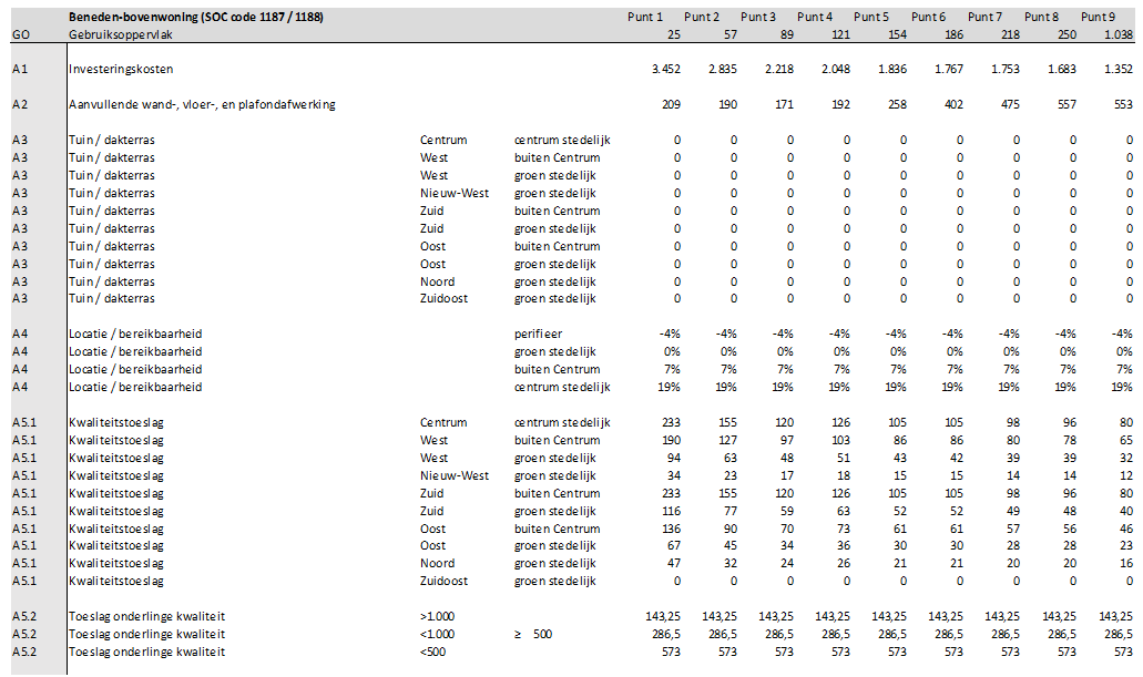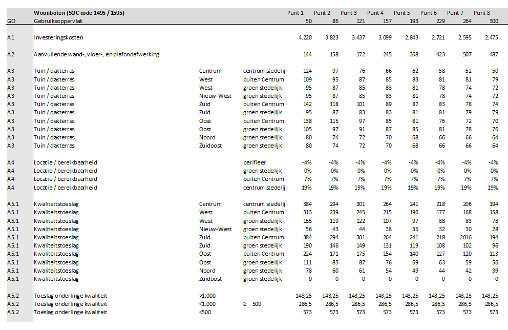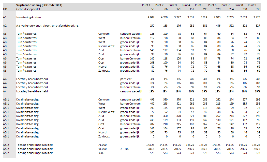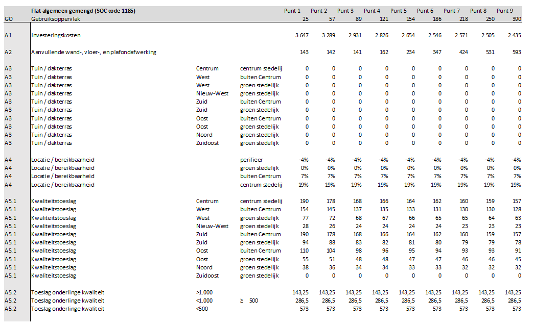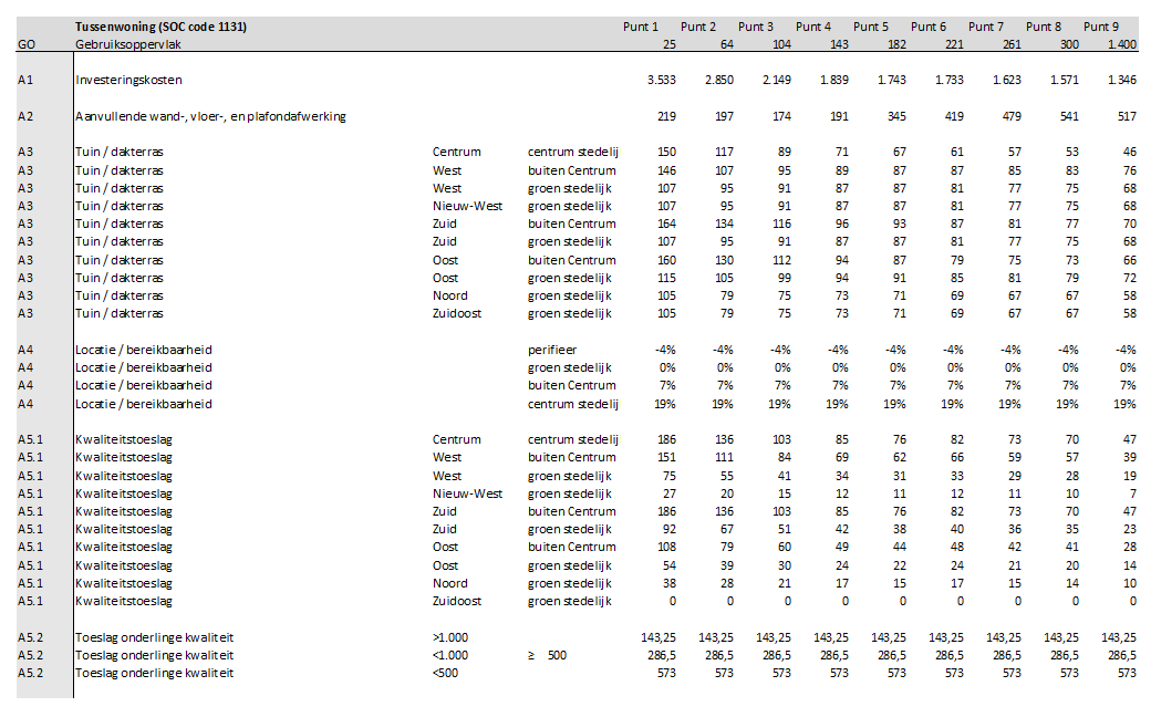 A1: De investeringskosten zijn per m2 GO voor alle afzonderlijke referenties voor diverse groottes bepaald.