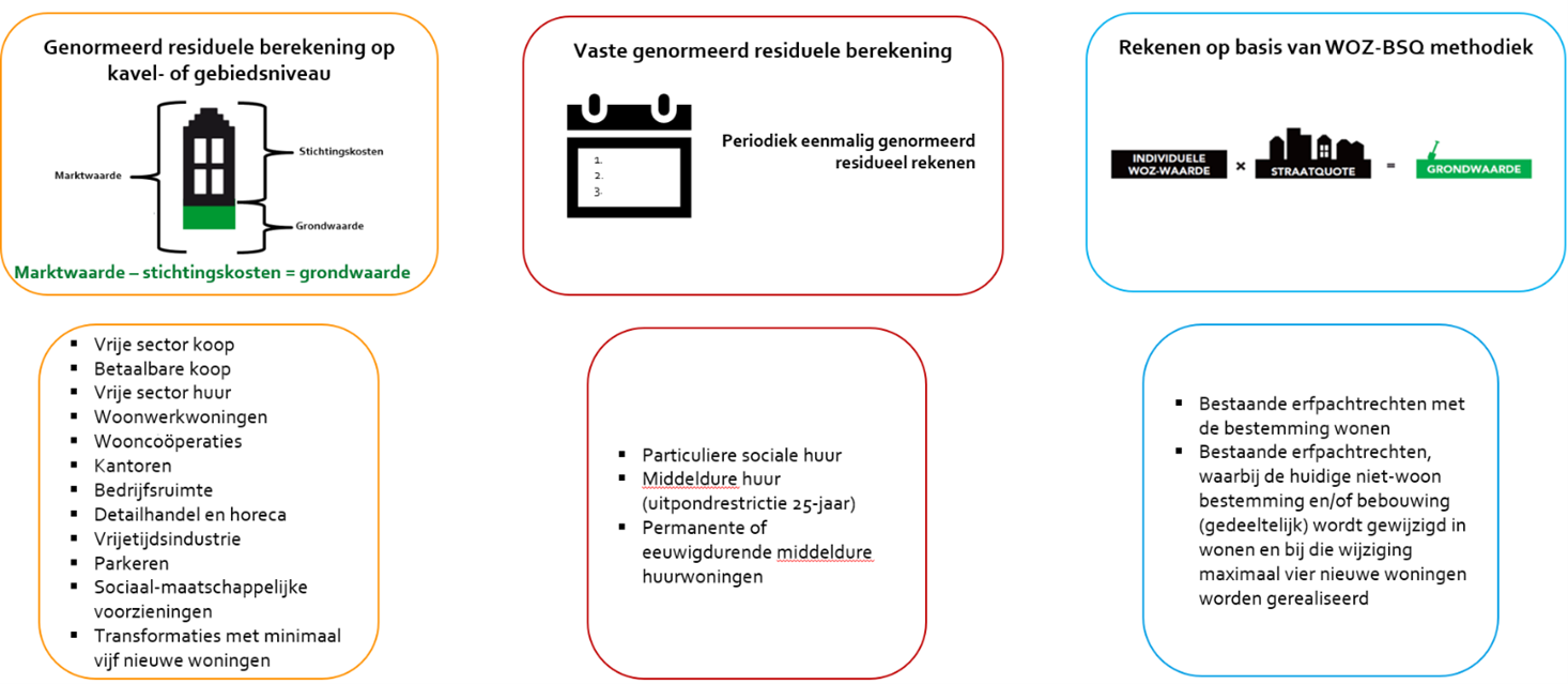 Grondwaarden worden zowel bij nieuwe erfpachtuitgifte als bestaande erfpachtrechten bepaald. De basis voor de grondwaardebepaling is zoveel als mogelijk de genormeerd residuele methode. Binnen deze methodiek zijn drie smaken te onderscheiden, namelijk een grondwaarde berekening op kavel- of gebiedsniveau, de WOZ/BSQ-methode en de vaste grondprijzen. Al deze smaken hebben als basis genormeerd residueel rekenen. Daarnaast gelden er minimale grondwaarden.
