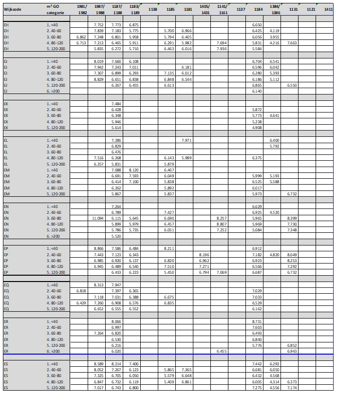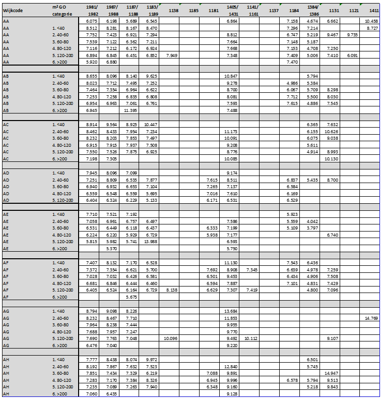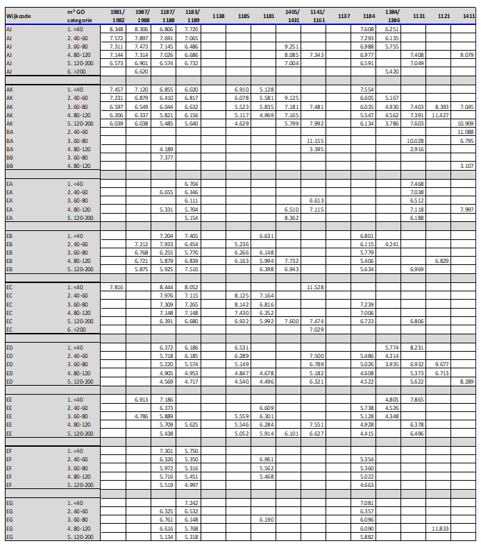 De bijlage bevat overzichten van de hoogte van de herbouwkosten per m² gebruiksoppervlak voor verschillende woningtypen bij verschillende woninggrootte. Daarnaast zijn de toegepaste gemiddelde WOZ-gegevens ten behoeve van een aanvullende kwaliteitsopslag opgenomen.
