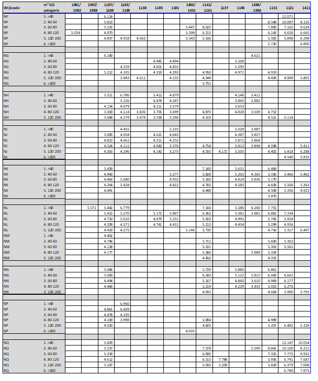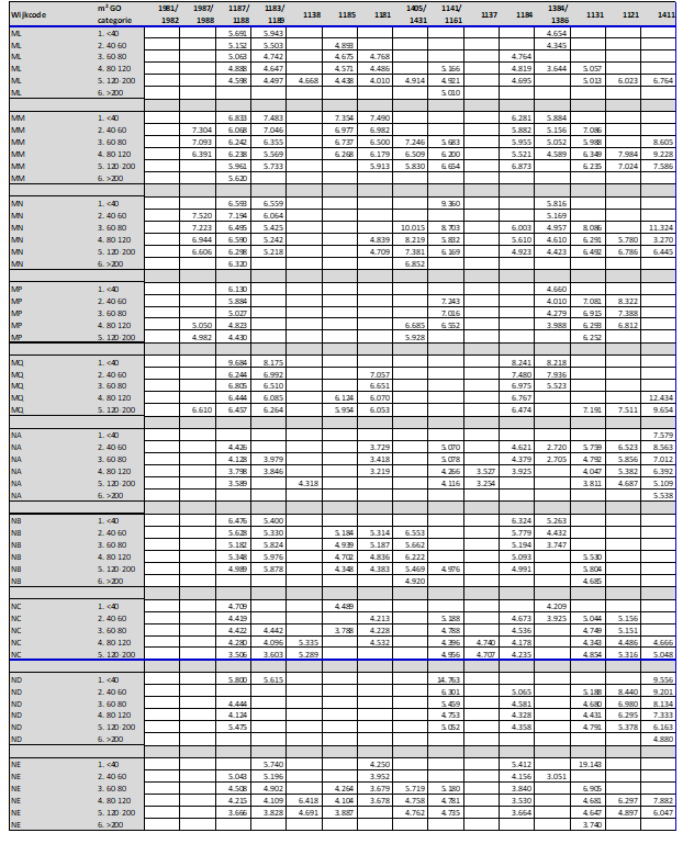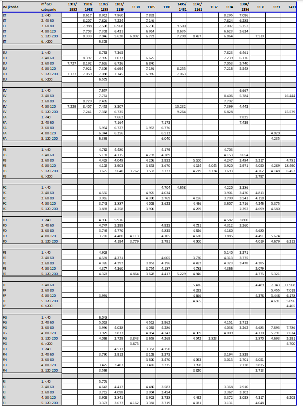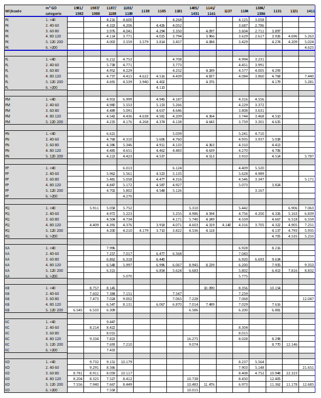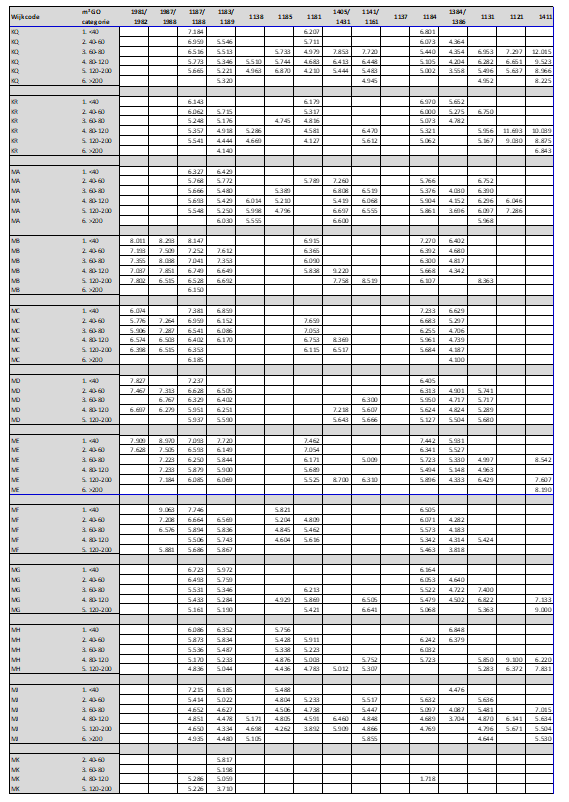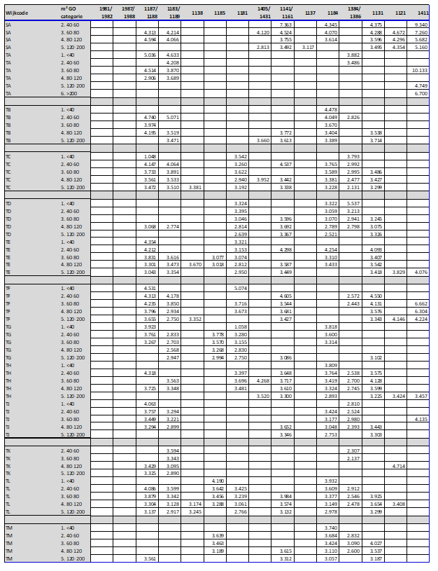 Door te differentiëren naar woningtypes en woninggroottes zijn de herbouwkosten bepaald voor 90% van alle woningen in de gemeente Amsterdam.30 Ondanks de gehanteerde differentiatie (en de gedetailleerde opbouw) blijft de bepaling van de herbouwkosten een modelmatige benadering. De gehanteerde herbouwkosten zullen daardoor niet precies aansluiten bij de verschillende individuele situaties. De herbouwkosten per woningtype en de gehanteerde meetpunten zijn in bijlage 4a opgenomen. Hieronder worden de woningtype en oppervlakte categorieën verder toegelicht.