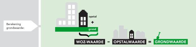 Amsterdam bepaalt de grondwaarde voor nieuw uit te geven én bestaande erfpachtrechten zo veel als mogelijk9 op basis van een genormeerde toepassing van de residuele methode. Residueel betekent dat de vastgoedwaarde wordt verminderd met de opstalwaarde. Wat overblijft (het residu) is de waarde die aan de (erfpacht)grond wordt toegeschreven. Oftewel opbrengst minus kosten is grondwaarde.