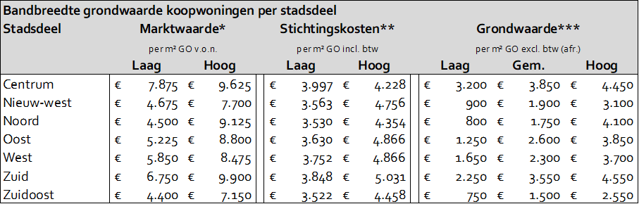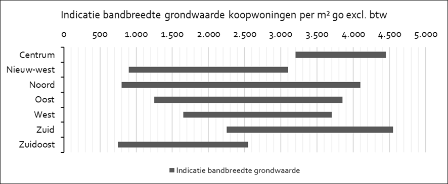Om voor nieuwe projecten een grondwaarde te kunnen vaststellen, wordt gebruik gemaakt van marktgegevens met o.a. vraag- en transactieprijzen en stichtingskostenreferenties. Onderstaande tabel geeft een indicatie per stadsdeel. De grondwaarden zijn tot stand gekomen op basis van de genormeerd residuele grondprijssystematiek. De gegevens zijn een uitvloeisel van interne indicatieve grondprijzen die zijn opgesteld voor de (meestal actieve) grondexploitaties. Dit maakt dat voor stadsdelen met maar beperkte grondexploitaties een smallere bandbreedte wordt getoond.