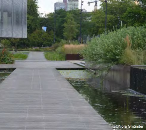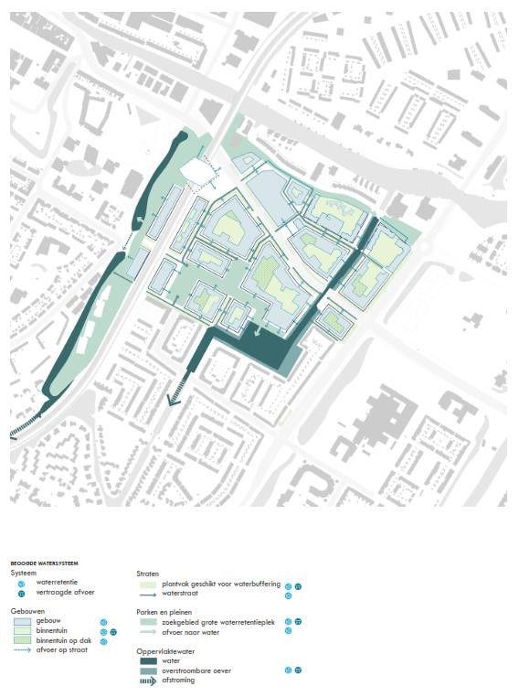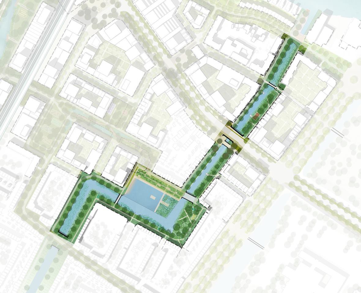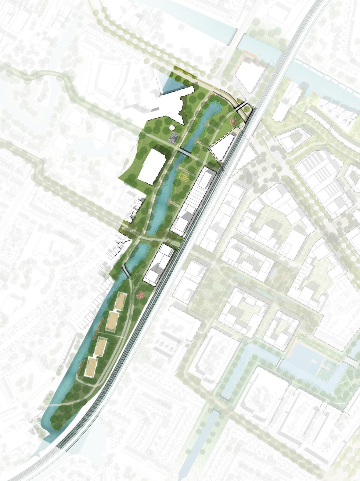 Het centrale waterbekken wordt beter toegankelijk gemaakt. Aan de noordwestzijde van het water grenst het bekken aan het meer gemengde deel van de nieuwe woonwijk. Hier wordt een wetland voorgesteld met vlonderpaden. Daarnaast worden trappen en vlonders gemaakt die toegang geven tot het water en een aangename ontmoetingsplek worden voor de hele wijk. Duikerbruggen worden op den duur vervangen voor ranke bruggen zodat water ook optische doorloopt.