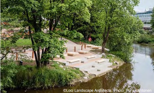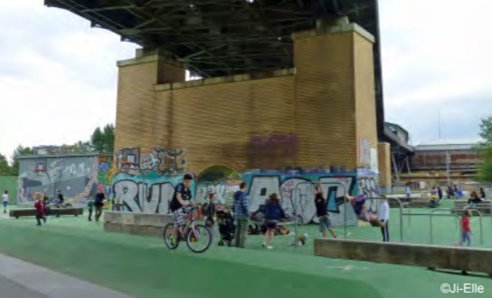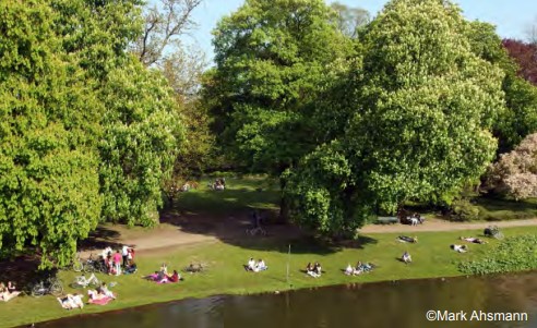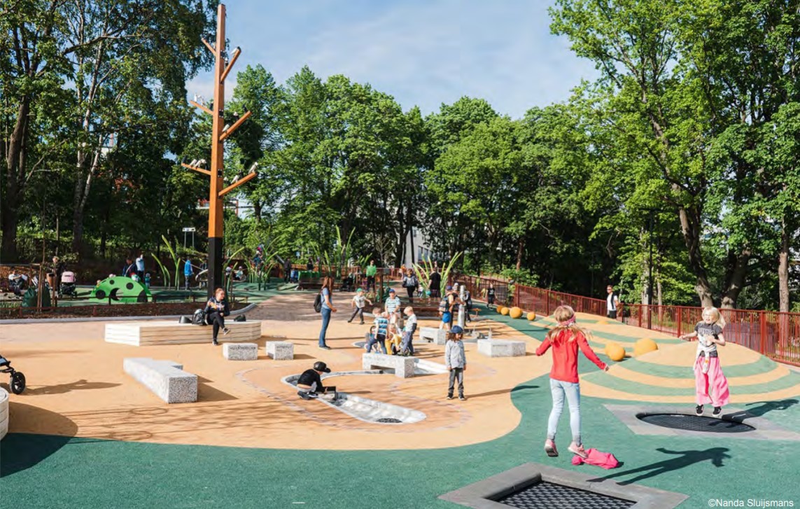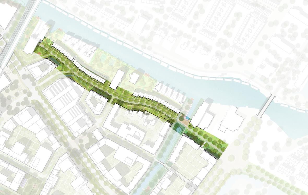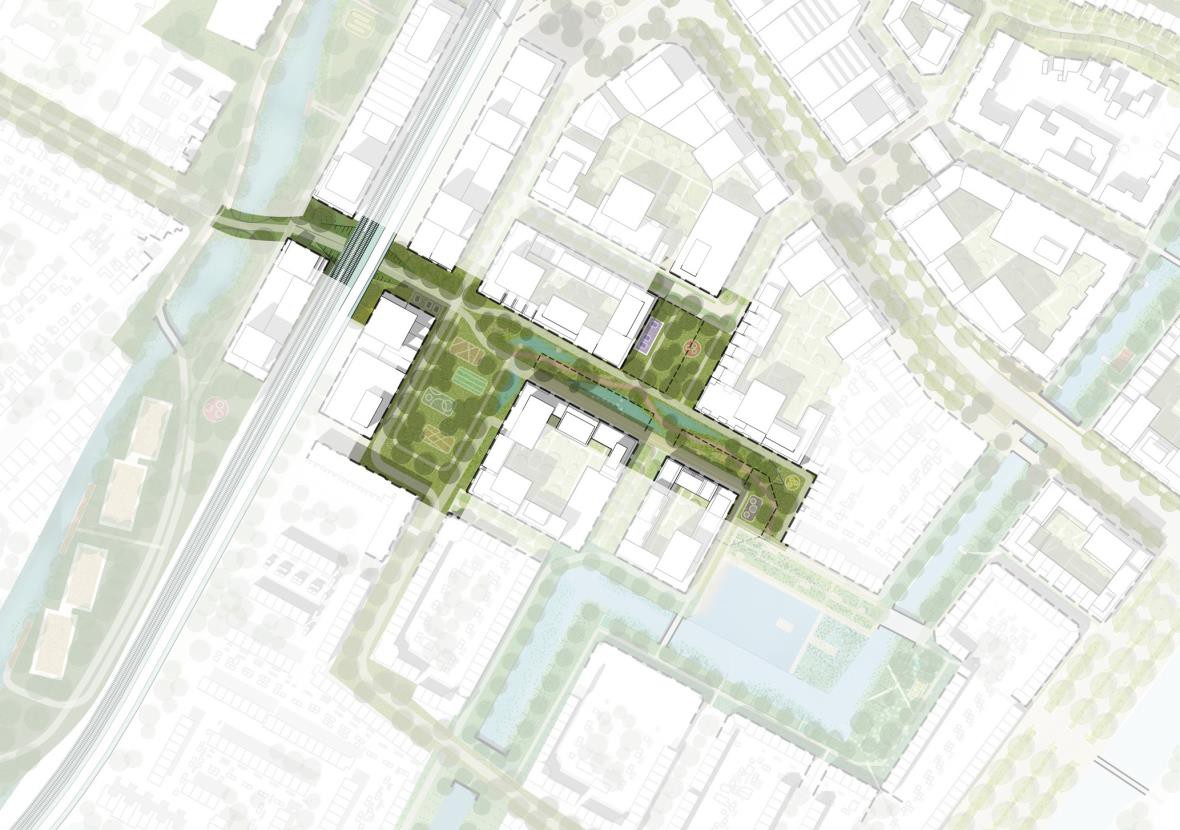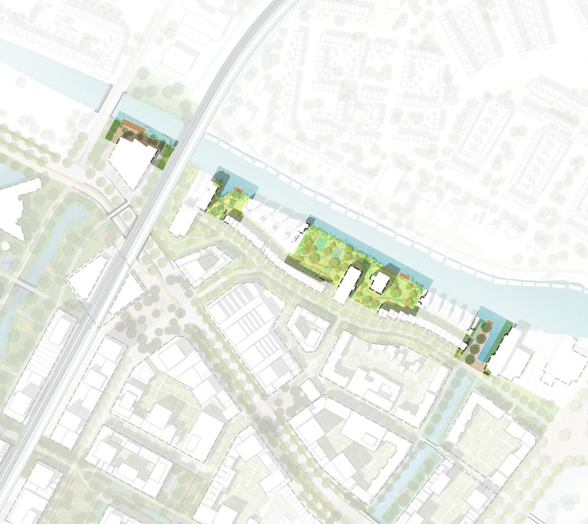 De waterkanten tussen de twee plekken in is rustiger en parkachtig van karakter. De speelplek wordt opgeknapt en aangevuld met klein sportprogramma. De waterrand wordt toegankelijk met enkele vlonders of verlaagde oeverranden.