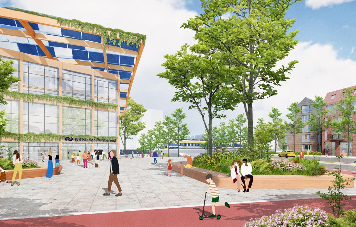 Het stationsplein wordt een fijne plek voor ontmoeting. Het plein is groen en lommerrijk door vele bomen. Langs de randen zijn er levendige plinten onder andere het station. Deze functies hebben ook ruimte op het plein voor eventuele terrassen. Op het plein is plaats voor kunst en publiek podium voor kleinschalige optredens.