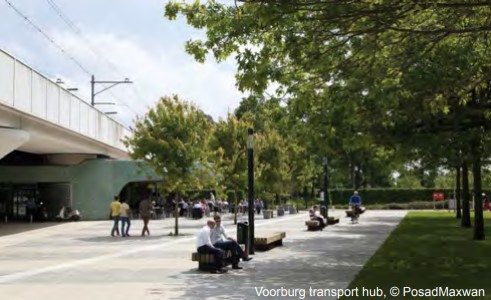Ter hoogte van het nieuwe OV-knooppunt (trein, HOV-lijn, bus) verandert de stadsboulevard in een stationsplein. Met de verbreding van de stadsboulevard wordt veel kwaliteit gewonnen en met het creëren van een voorplein en nieuwe entree van het multimodale knooppunt wordt het geheel een interessante, dynamische openbare ruimte.