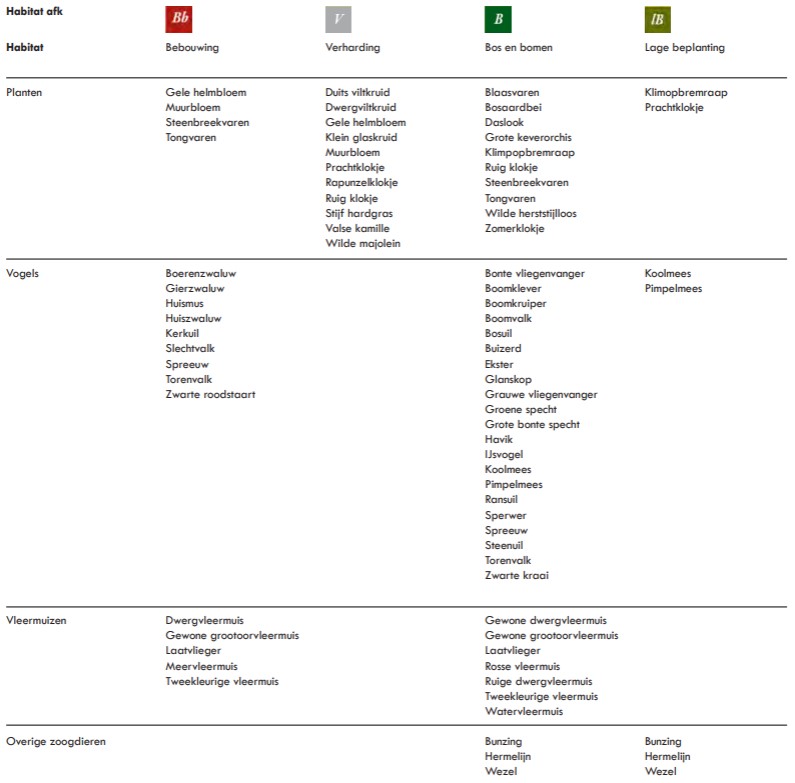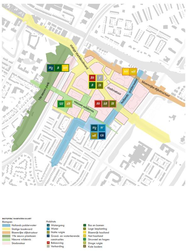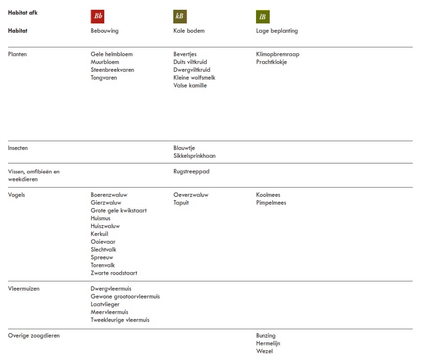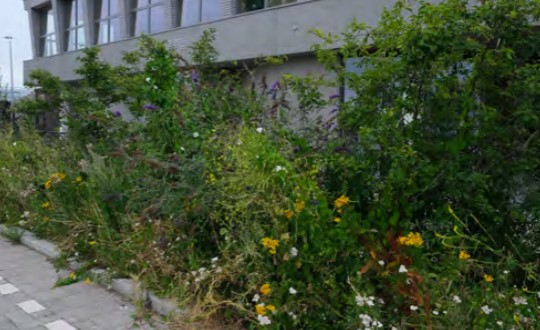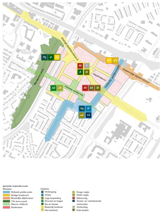 Naast voornamelijk inheems beplantingen worden er ecologische voorzieningen aangebracht passend bij de habitattypes (droge ruigte, struweel en hagen). Belangrijk is dat er ook beleefbare natuurinclusieve maatregelen worden gemaakt o.a. gekoppeld aan de schoolplein en speelpek. Bijvoorbeeld een beestenboom.