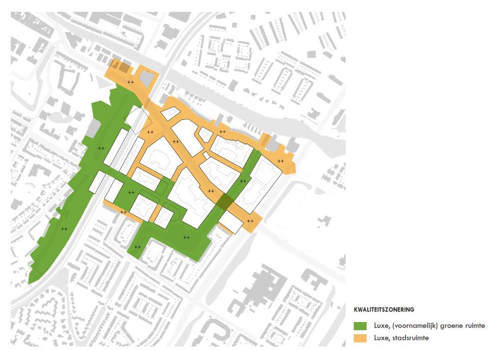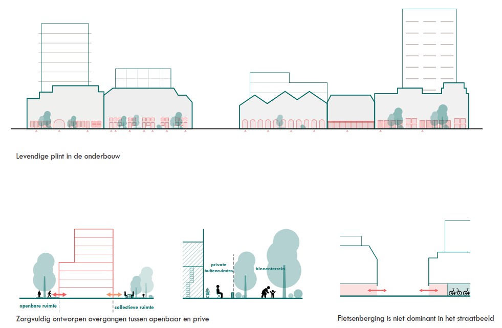 Parallel aan de ontwikkeling van de gebouwen zal de gemeente de openbare ruimte verder uitwerken, zodat er een goede aansluiting tussen beide kan worden vormgegeven en eventueel publiek programma in de plinten stallingsmogelijkheden in de openbare te bieden of een overgang tussen prive en publiek te verzachten door het toevoegen van geveltuinen of groenstroken langs de gevels. Hierbij wordt de ondergrond goed afgestemd met de bovengrond.