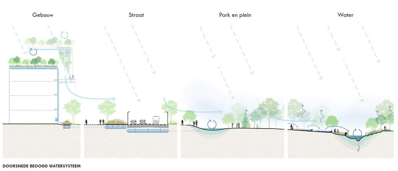 De openbare ruimte in het Waterlandkwartier vormt een groen raamwerk waarbinnen nieuwbouw wordt ontwikkeld. De openbare ruimte wordt ingezet om ambities en doelstellingen van de wijk, zoals beschreven in de voorgaande hoofdstukken, te borgen. Naast deze programmatische- en duurzaamheidsdoelstellingen zijn er praktische en esthetische doelen. Al deze doelen samen vragen zowel onder- als bovengronds een nieuwe indeling en nieuw ontwerp van de openbare ruimte. Om eenheid te creëren zijn er overkoepelende spelregels voor de inrichting, materialisatie en kwaliteit opgesteld. Deze zijn ook verbonden aan het beoogde beheerniveau.