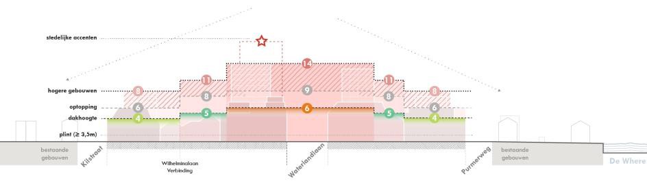 De Waterlandlaan is als stedelijke boulevard een logische plek om een belangrijk deel van het programma te situeren – vanwege de bezonning, het uitzicht, haar rol als verbindende schakel in het lineaire centrum van Purmerend met het station en de HOV haltes. De bouwvelden langs de Waterlandlaan en de Gorslaan zijn dan ook relatief dichter en hoger. De bouwvelden die verder van de Waterlandlaan liggen hebben een lagere dichtheid en maximale bouwhoogte is er lager dan aan de Waterlandlaan. Hierdoor ontstaat een goede overgang met de omliggende bebouwing.