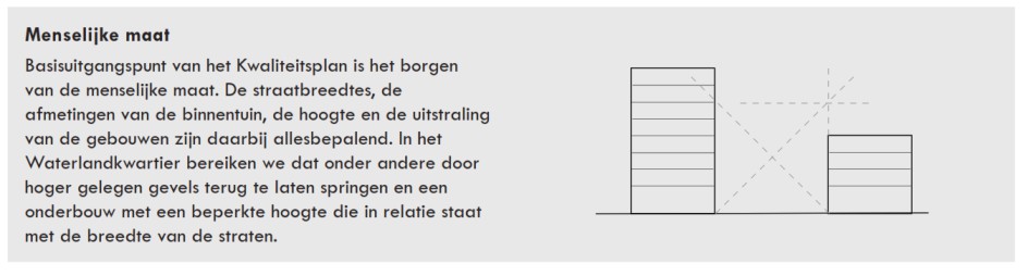 Door het gebruik van goede maatverhoudingen, interessante gevels (met setbacks en toegevoegde beeldbepalende elementen; bijvoorbeeld balkons), schaalverkleining binnen de volumes, mooie materialen, voldoende groen en zon en goede overgangen van privé naar openbaar de beleving ontstaat er een unieke beeldtaal. Op straat zal dit door de vele gevelvlakken een gelaagd beeld opleveren, dat onder verschillende hoeken steeds een ander perspectief oplevert. De combinatie van nieuwe en bestaande gebouwen en de toevoeging van de 21ste eeuwse skyline zorgen voor een bijzondere gelaagdheid van de bebouwing in het Waterlandkwartier.
