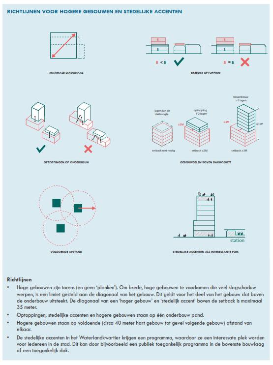 Door de splitsing van de bebouwing in een onderbouw en een bovenbouw ontstaat een unieke beeldtaal met setbacks, schaalverkleining binnen de panden, gevelopbouw, wisselende bouwhoogtes, de vele terrassen en groene daken. Op straat zal dit door de vele gevelvlakken een gelaagd beeld opleveren, dat onder verschillende hoeken steeds een ander perspectief oplevert. De combinatie van nieuwe en bestaande gebouwen en de toevoeging van de 21ste eeuwse skyline zorgen voor een bijzondere gelaagdheid van de bebouwing in het Waterlandkwartier welke samen met het raamwerk resulteert in een unieke woonkwaliteit, een hoge verblijfskwaliteit in de openbare ruimte, een groen en bruikbaar dakenlandschap en een uniek stadsbeeld: ‘groeikern van de toekomst’.