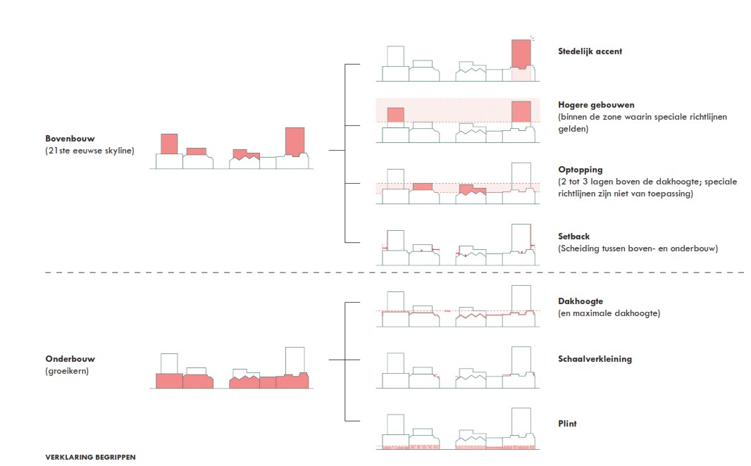 De bebouwing in het Waterlandkwartier bestaat uit een ‘onderbouw’ die gestoeld is op de uitgangspunten van de ‘groeikernarchitectuur’ uit de jaren zeventig en een ‘21ste eeuwse skyline’ bestaande uit optoppingen en hogere gebouwen. De bovenbouw is daarbij zichtbaar anders dan de onderbouw. De bovenbouw wordt in zijn geheel of getrapt teruggelegd. Deze setbacks zorgen voor meer daglicht, bezonning en lucht op straatniveau en in de binnentuinen, ze dragen bij aan het terugdringen van windval bij hogere gebouwen en worden ingezet om de menselijk maat en schaal te vinden in een wijk met een hoge dichtheid.