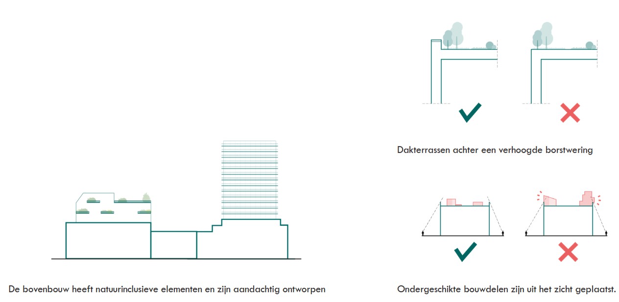 De bovenbouw in het Waterlandkwartier vormt een eigentijdse 21ste eeuwse skyline. De bovenbouw bestaat uit optoppingen, hogere gebouwen en stedelijke accenten. De hogere gebouwen en stedelijke accenten zijn slank, licht, hebben een eenvoudig silhouet en zijn contrasterend met de onderbouw. De Bovenbouw oogt ‘licht’. Er wordt veel gebruik gemaakt van glas, hout, groen en andere transparante materialen.