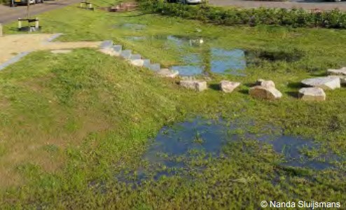 Nieuwbouw tussen de Purmerweg en de Waterlandlaan laat ruimte aan de voet van de dijk. Hierdoor ontstaat een langgerekte zone, die kan worden ingericht als bufferzone voor hemelwater. Daarom heen worden ook verblijfsplekken gemaakt. Er dient specifieke aandacht te zijn voor de waterproblematiek van de bestaande woningen gelegen aan de voet van de dijk.