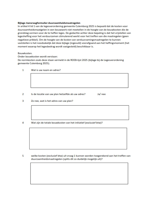 De bouwkosten van een of meerdere duurzaamheidsmaatregelen die onderdeel vormen van een totale aanvraag om een omgevingsvergunning voor een bouwactiviteit of aanlegactiviteit als bedoeld in artikel 2.5, 2.6, 2.8, 2.9 en 2.28 van de tarieventabel en zoals nader omschreven in de bijlage duurzaamheidsmaatregelen behorende bij deze verordening. Deze kosten worden niet betrokken bij het vaststellen van de omvang van de totale bouwkosten.