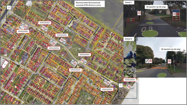 ● deze maatregel wordt uitgevoerd door het plaatsen van begin/einde zoneborden A1-30 van bijlage 1 van het RVV 1990 op de Schoolstraat aan de noordzijde ter hoogte van het kruispunt met de Hoofdweg (N371) en aan de zuidzijde ter hoogte van de grens van de bebouwde kom;