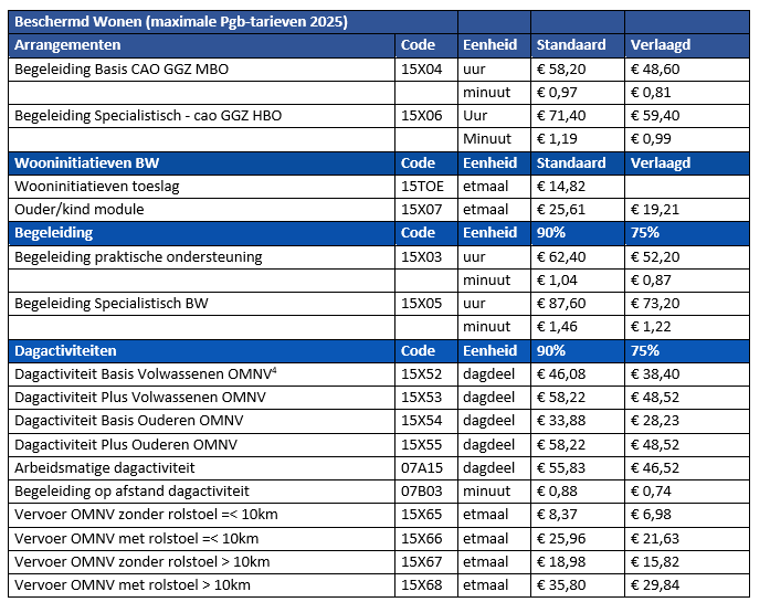 Het Pgb voor de zorgarrangementen Beschermd Wonen wordt gebaseerd op 90% van één van de twee in omloop zijnde zorginstellingstarieven (standaard en verlaagd). In een enkele overgangssituatie kan een 75%-tarief aan de orde zijn. Informele hulp, zoals wonen bij ouders of wettelijke vertegenwoordigers, zich niet voor een Pgb voor beschermd wonen.