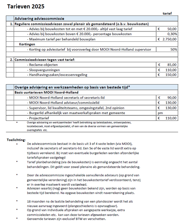 voor een advies van de gemeentelijke adviescommissie als bedoeld in de Verordening op de gemeentelijke adviescommissie omgevingskwaliteit Heiloo 2024 dat uitsluitend betrekking heeft op redelijke eisen van welstand, zoals bedoeld in de gemeentelijke beleidsregels, bedoeld in artikel 4.19 van de Omgevingswet: het toepasselijke tarief kan worden geraadpleegd in bijlage 1.